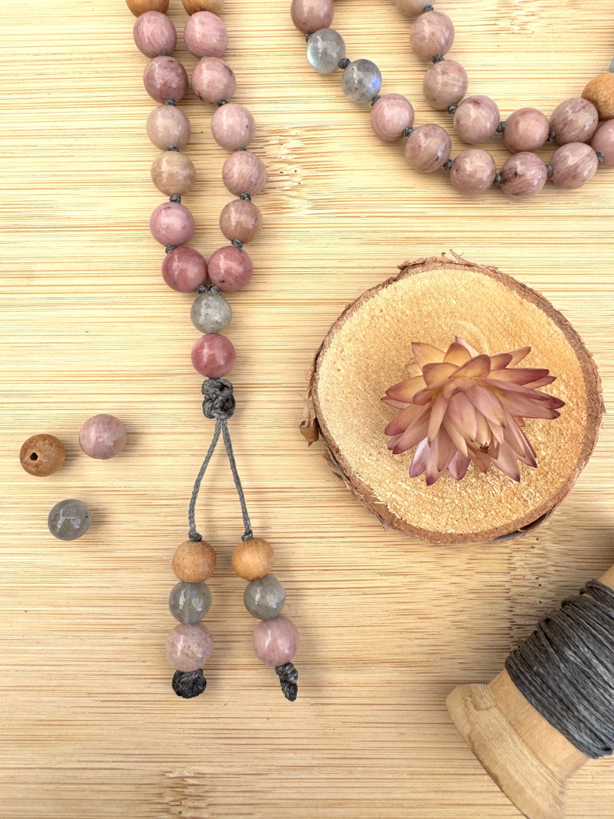 Mala aus Rhodrocrosit-Steines mit vereinzelten Sandelholz-Perlen und Labradorit Steinen